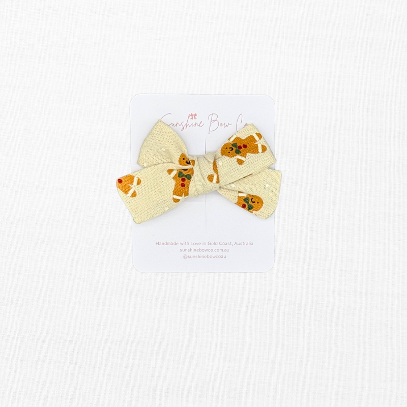 The Gingerbread Classic Bow is a charming addition to your little one's holiday wardrobe. Crafted in soft, neutral tones, this festive bow is perfect for adding a touch of Christmas magic to any outfit.