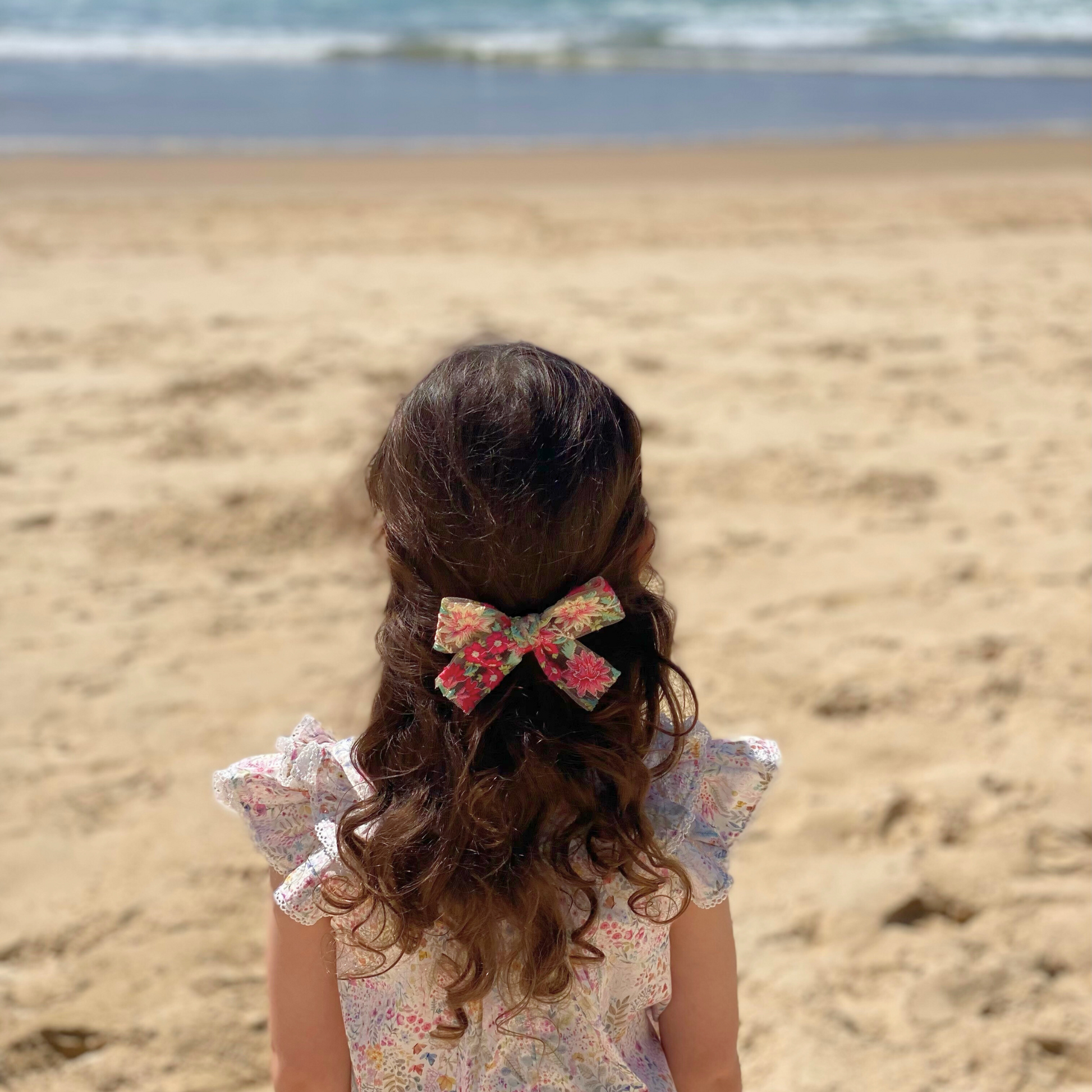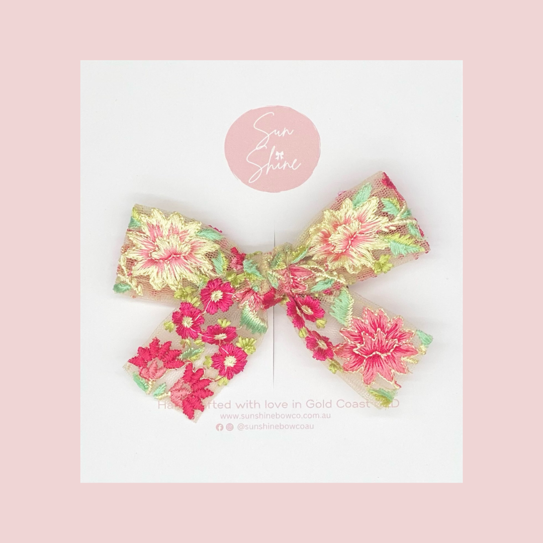 Floral Elegance in Pink: The "Katherine" Embellished Hair Bow is a timeless beauty adorned with delicate floral patterns in a charming shade of pink, exuding classic classiness and prettiness.