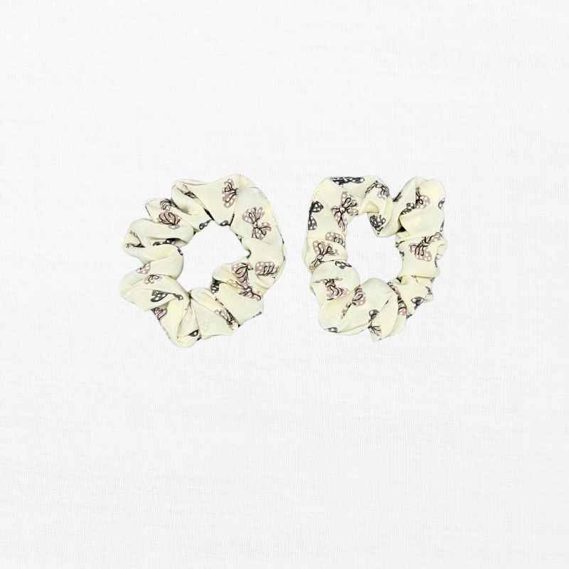 The neutral base features charming bow prints in subtle grey tones, making them a versatile choice for any outfit. Each set includes two scrunchies, perfect for creating adorable pigtails or adding a touch of elegance to a bun.